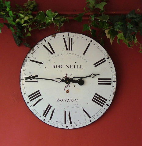 aged white Rob Neill clock with classic Roman numerals and elegant dials. |